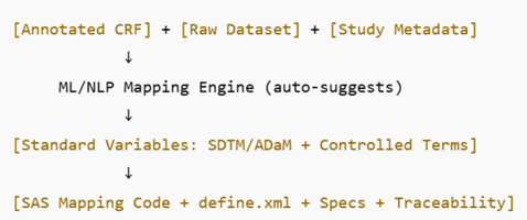 Mapping raw healthcare data to CDISC SDTM and ADaM is complex, requiring accuracy and regulatory compliance. Manual mapping is slow and error-prone, while machine learning enables auto- and smart-mapping by reusing knowledge from past datasets. Using metadata, NLP, and standards libraries, ML predicts new mappings and reduces manual effort. Automated SAS programme generation further streamlines workflows, improving efficiency, quality, and compliance.